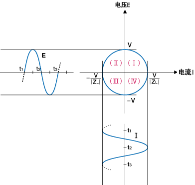 在电阻(R)负荷中原本为直线的负荷线,在电感(L)负荷中就成为如图2所示的圆形。 由纵轴与横轴所分割的图形的四个区域,称作「象限」。 当负荷为电阻时,负荷线只通过第一象限(Ⅰ)和第三象限(III),不通过第二象限(II)和第四象限(IV)。 但是,如果负荷为电感或电容的时候,那么负荷线从第一象限到第四象限就都会穿过。